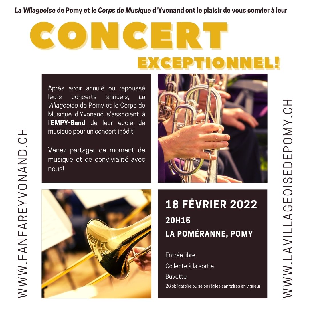 C’est avec grand plaisir et impatience que nous vous convions à notre concert inédit en collaboration avec le Corps de Musique d’Yvonand et l’EMPY, notre école de musique commune!