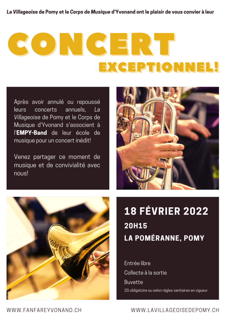 C’est avec grand plaisir et impatience que nous vous convions à notre concert inédit en collaboration avec le Corps de Musique d’Yvonand et l’EMPY, notre école de musique commune!
